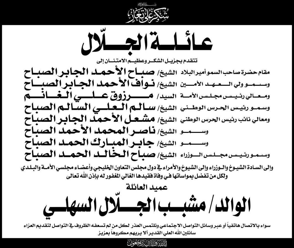 المجلس On Twitter شكر على تعاز تتقدم عائلة الجلال بجزيل الشكر وعظيم الامتنان لكل من قدم واجب العزاء بوفاة عميد عائلة الجلال المرحوم بإذن الله مشبب الجلال السهلي سائلين المولى عز