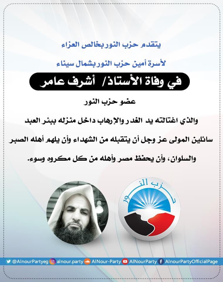 حزب النور On Twitter يتقدم حزب النور بخالص العزاء لأسرة أمين حزب النور بشمال سيناء في وفاة الأستاذ أشرف عامر عضو حزب النور والذي اغتالته يد الغدر والإرهاب داخل منزله ببئر