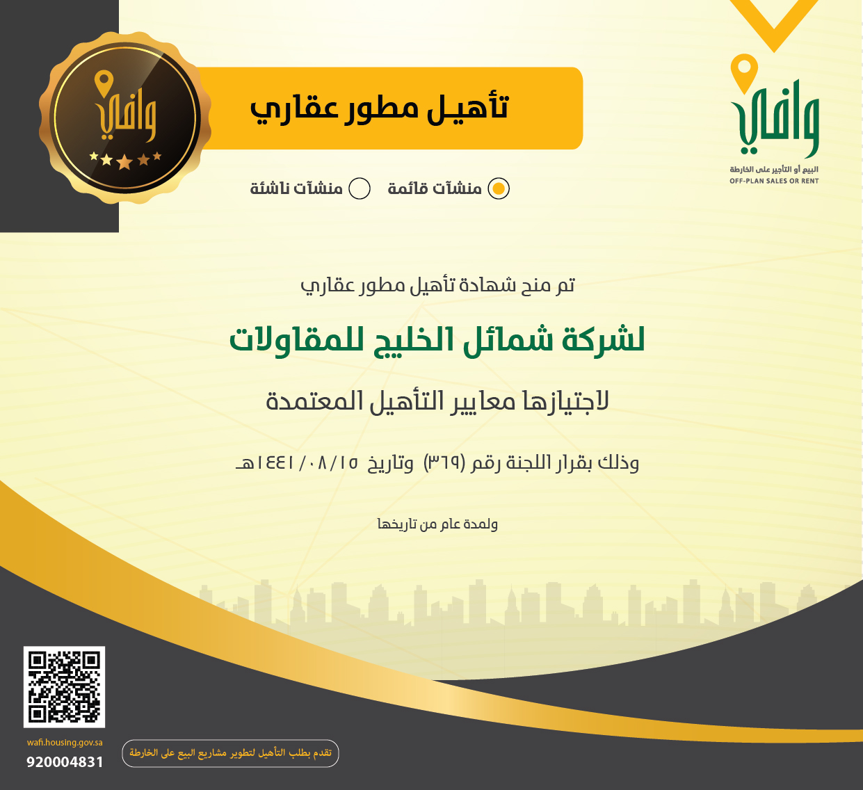 وافي On Twitter إصدار شهادة تأهيل مطور عقاري لشركة شمائل الخليج للمقاولات وافي وزارة الإسكان