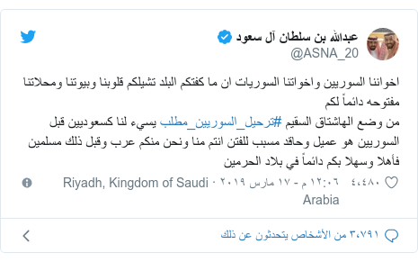 في النهاية إن طرد السوريين من الإمارات بين الفينة والأخرى لا يخرج عن كونه إحدى أشكال دعمها للنظام السوري ومن المفترض طرد الأشخاص المدرجين ضمن قائمة العقوبات الدولية فإن السلطات هناك تتكتم عنهم وتشجع بقاءهم بفضل. تصدر هاشتاغ ترحيل السوريين من السعودية ترند مواقع التواصل في السعودية ب 55 ألف تغريدة على التويتر وهذا ما.