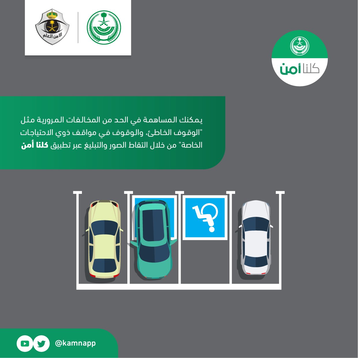 كـ ـلـ ـنا أمـ ـن A Twitteren يمكنك المساهمة في الحد من المخالفات المرورية مثل الوقوف الخاطئ والوقوف في مواقف ذوي الاحتياجات الخاصة من خلال التقاط الصور والتبليغ عبر تطبيق كلنا أمن