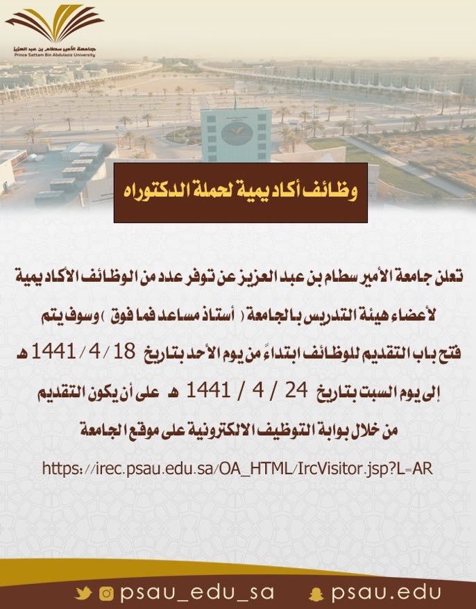 الأكاديميون السعوديون On Twitter تعلن جامعة الأمير سطام بن عبدالعزيز عن توفر عدد من الوظائف الأكاديمية لأعضاء هيئة التدريس أستاذ مساعد فما فوق Https T Co Lldpklyru0 Https T Co Ryh84kwqpp